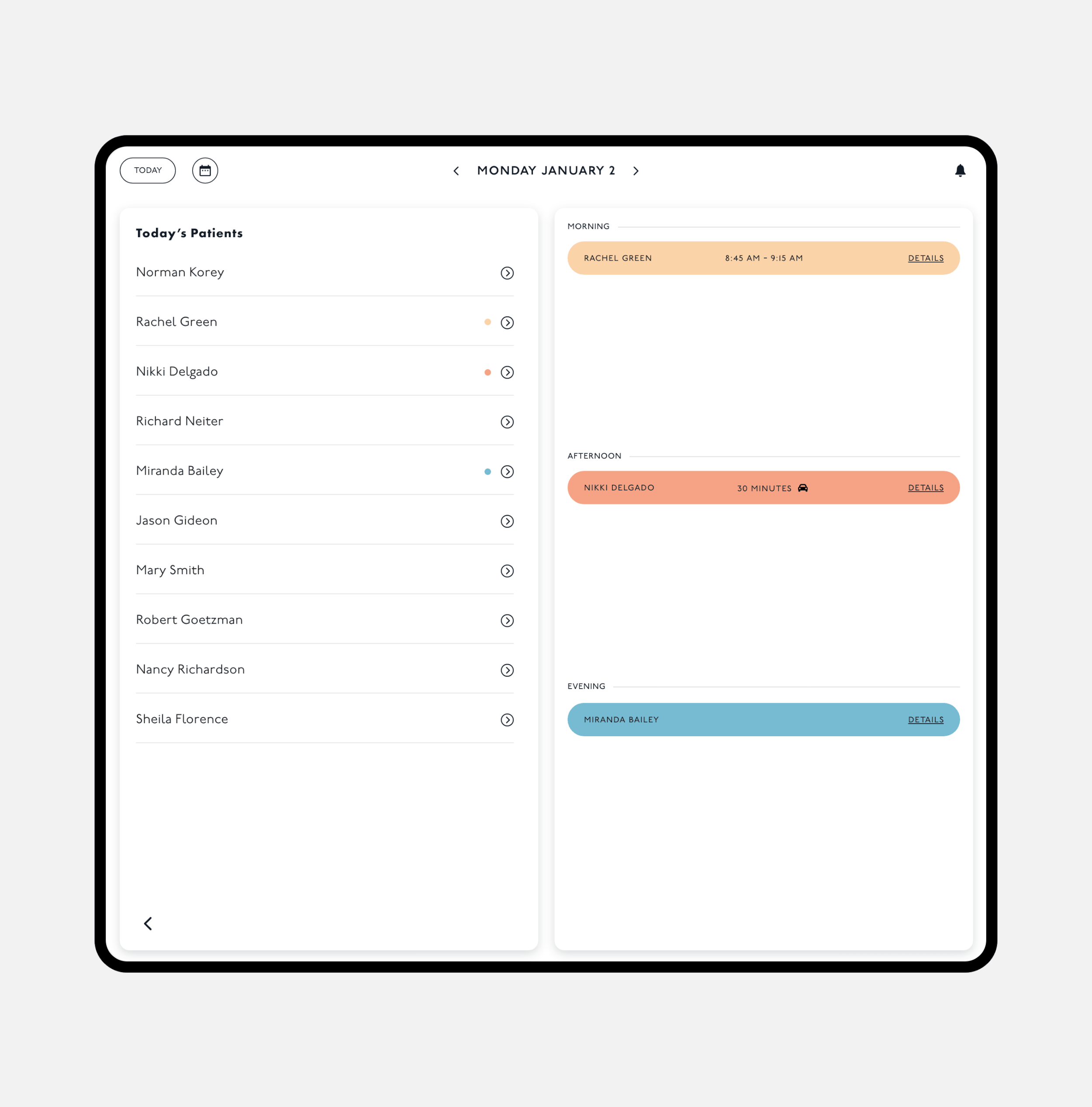 "At my location, the setting of specific appointments is laughable. Since we are dealing with humans and multiple moving pieces-meals, toileting, nursing family visits, flexibility is king. I usually have a printed schedule that lists my patients, number of minutes, and documents. I hand write on the daily printed schedule any pertinent notes which I usually get word of mouth or via email"