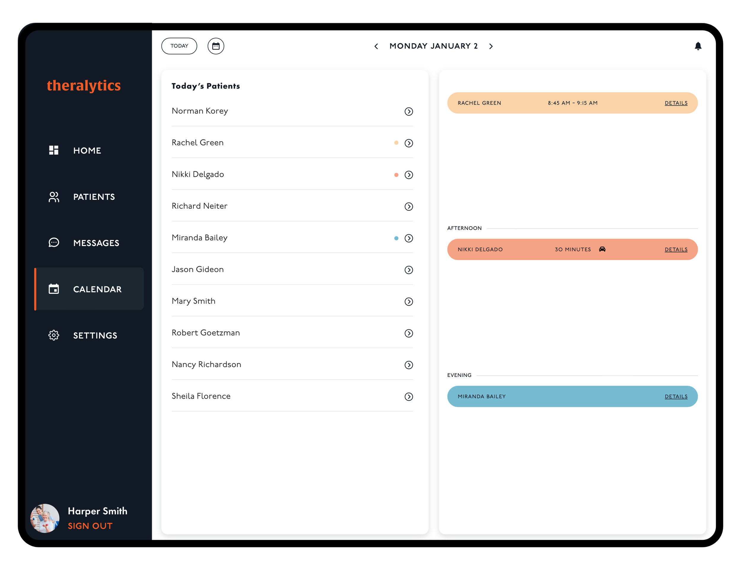 Theralytics addresses problems from different users who ultimately come to the same solutions. On one hand, we have the patients and their families; they are completely in the dark about their progression of care. There is no clear path. On the other hand, we have therapists working between multiple different softwares, preparing extensive documentation and seeing 10-15 patients a day. All the while their current systems are collecting unstructured data.