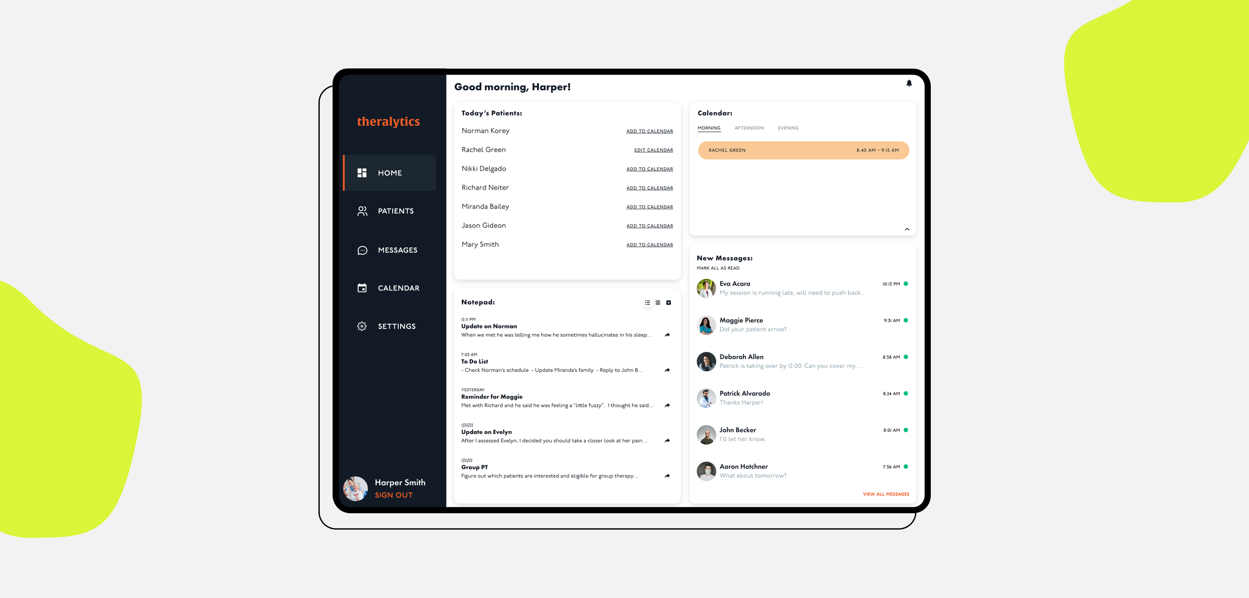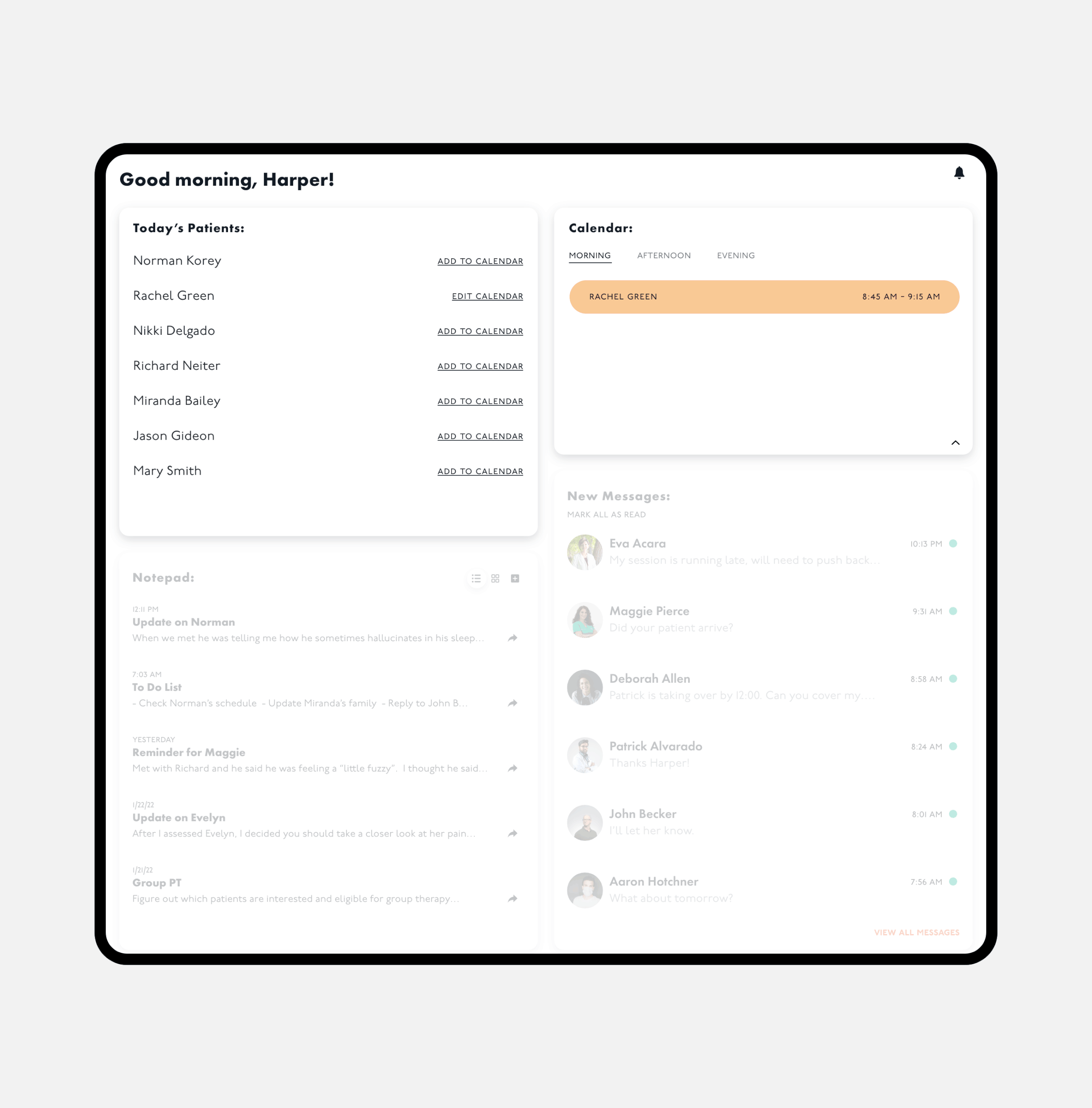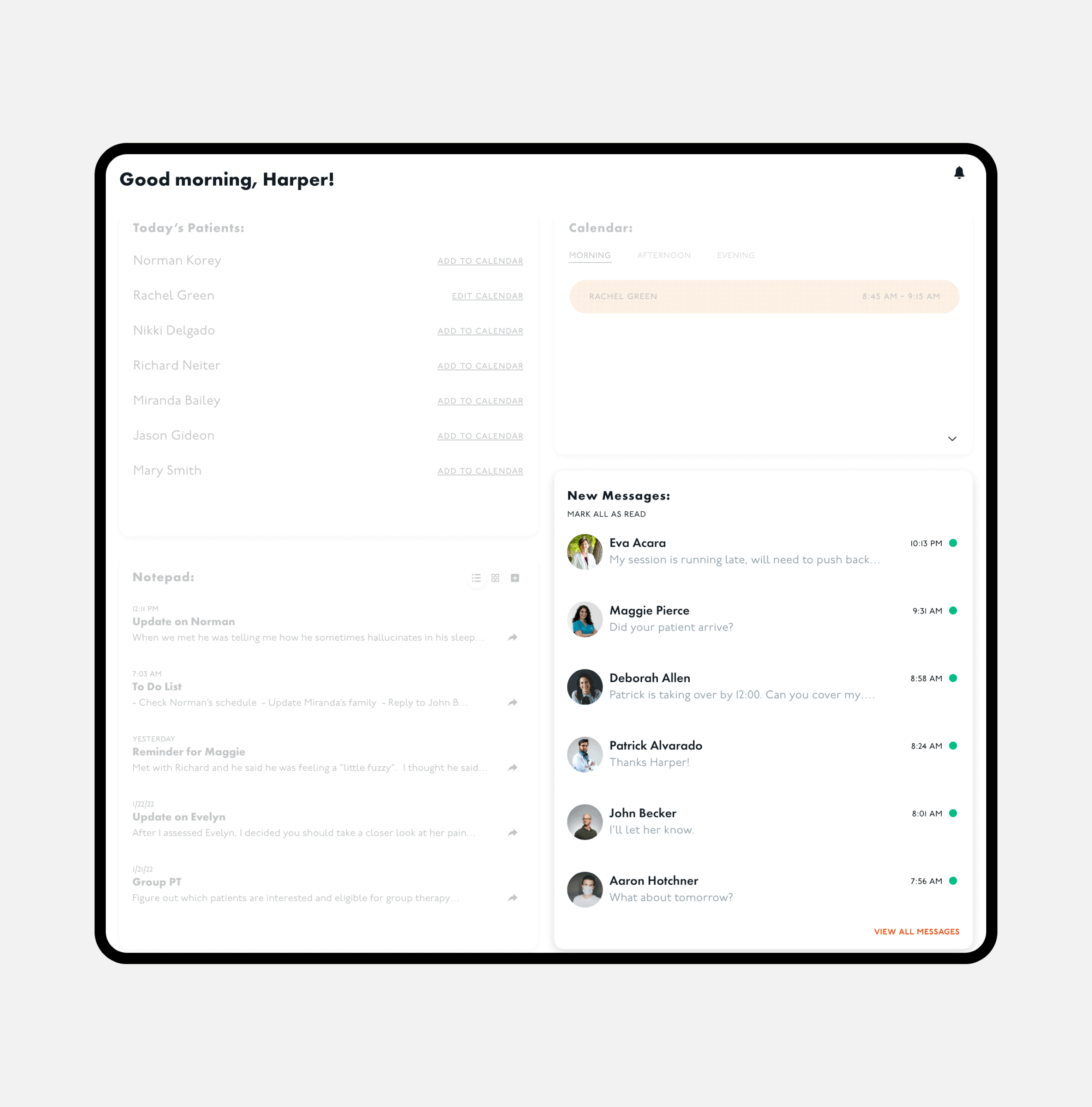 an orderly list of assigned patients with a dynamic personal calendar.